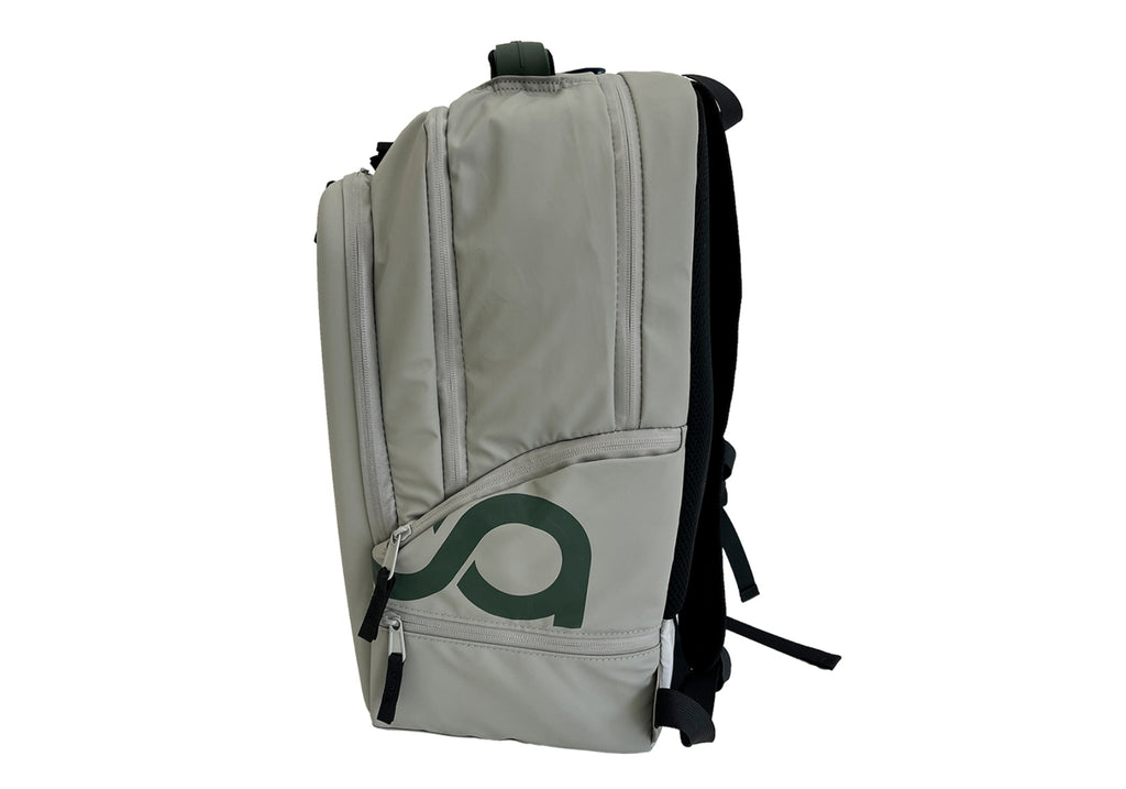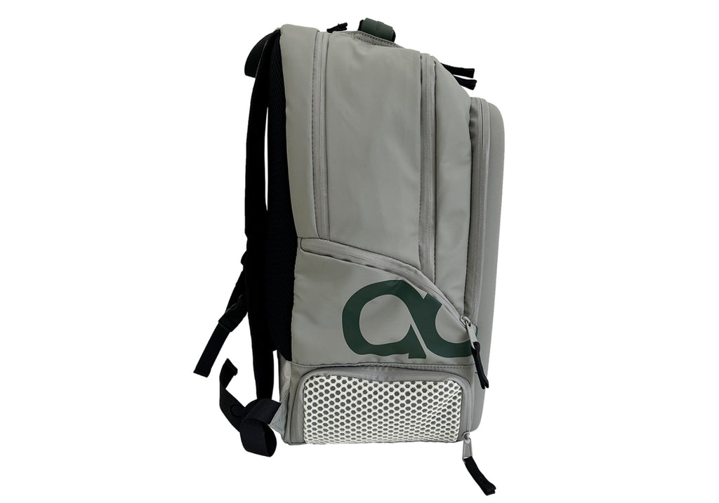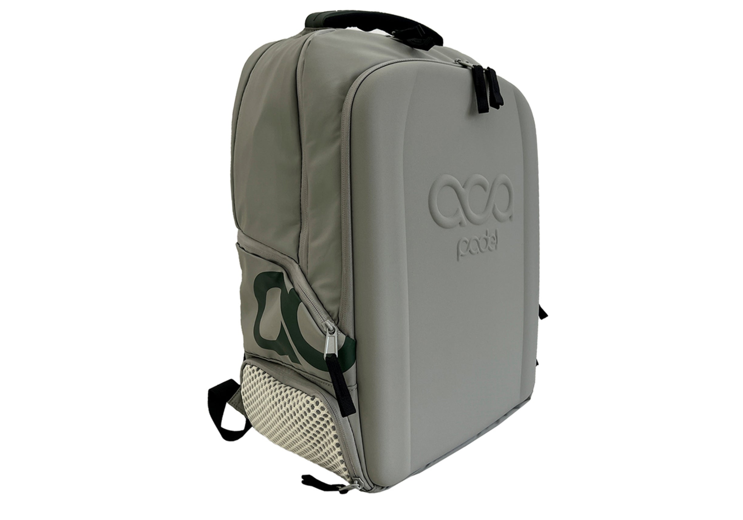 Un Mochila back pack termificada con compartimiento suficientemente grande para dos Palas, compartimento central para ropa, bolas etc, espacio dedicado a tus zapatos o ropa sucia y un compartimento frontal con tapa dura para que lleves tu Lap, artículos personales etc… los Materiales son Poliéster plastificado y cierre herméticos que la vuelven prácticamente impermeable.