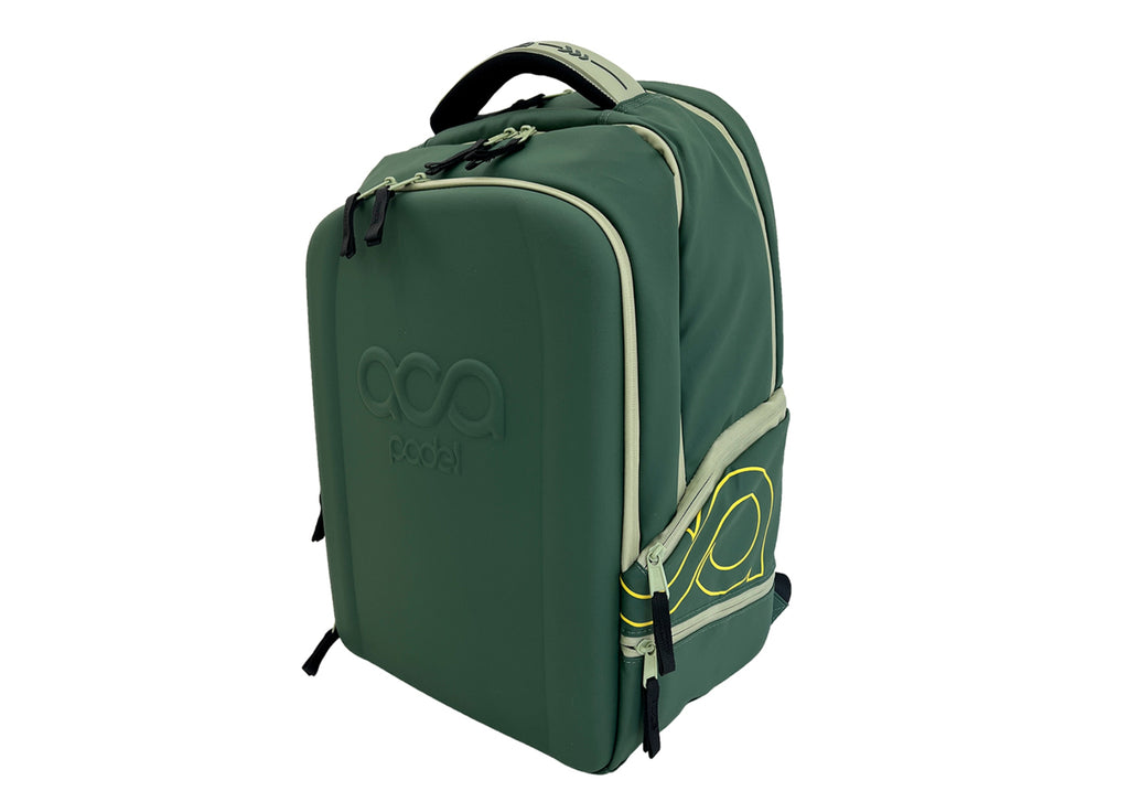 Un Mochila back pack termificada con compartimiento suficientemente grande para dos Palas, compartimento central para ropa, bolas etc, espacio dedicado a tus zapatos o ropa sucia y un compartimento frontal con tapa dura para que lleves tu Lap, artículos personales etc… los Materiales son Poliéster plastificado y cierre herméticos que la vuelven prácticamente impermeable.