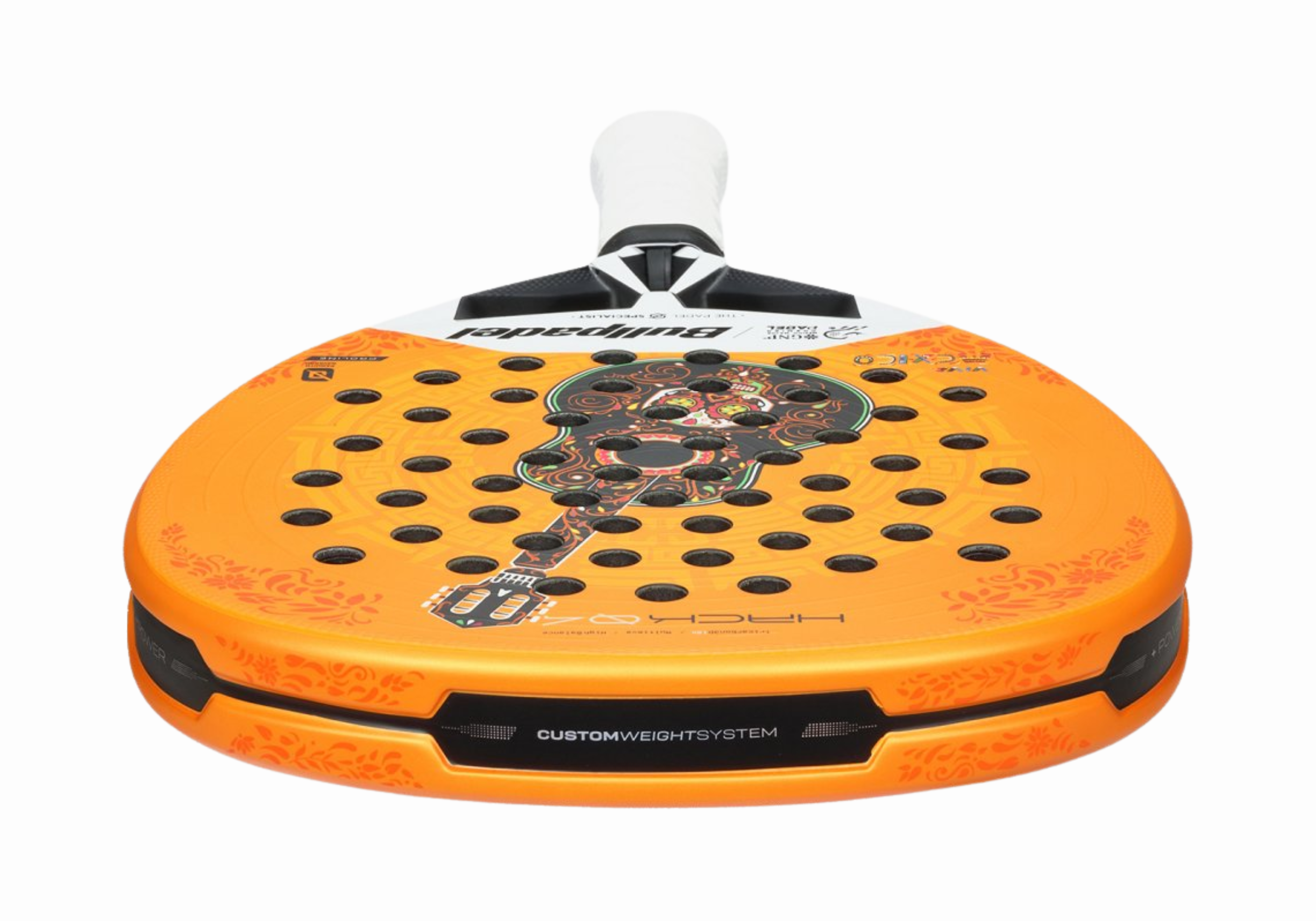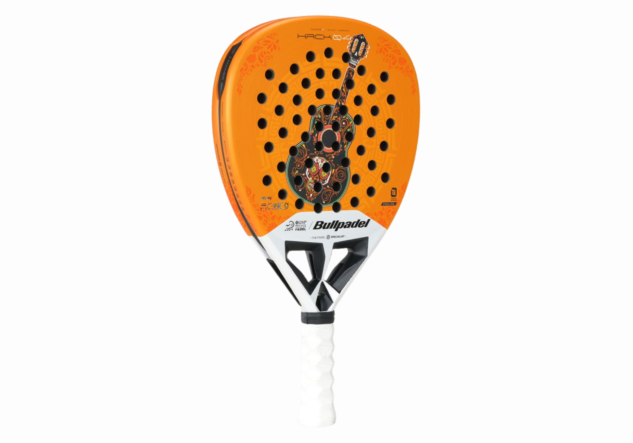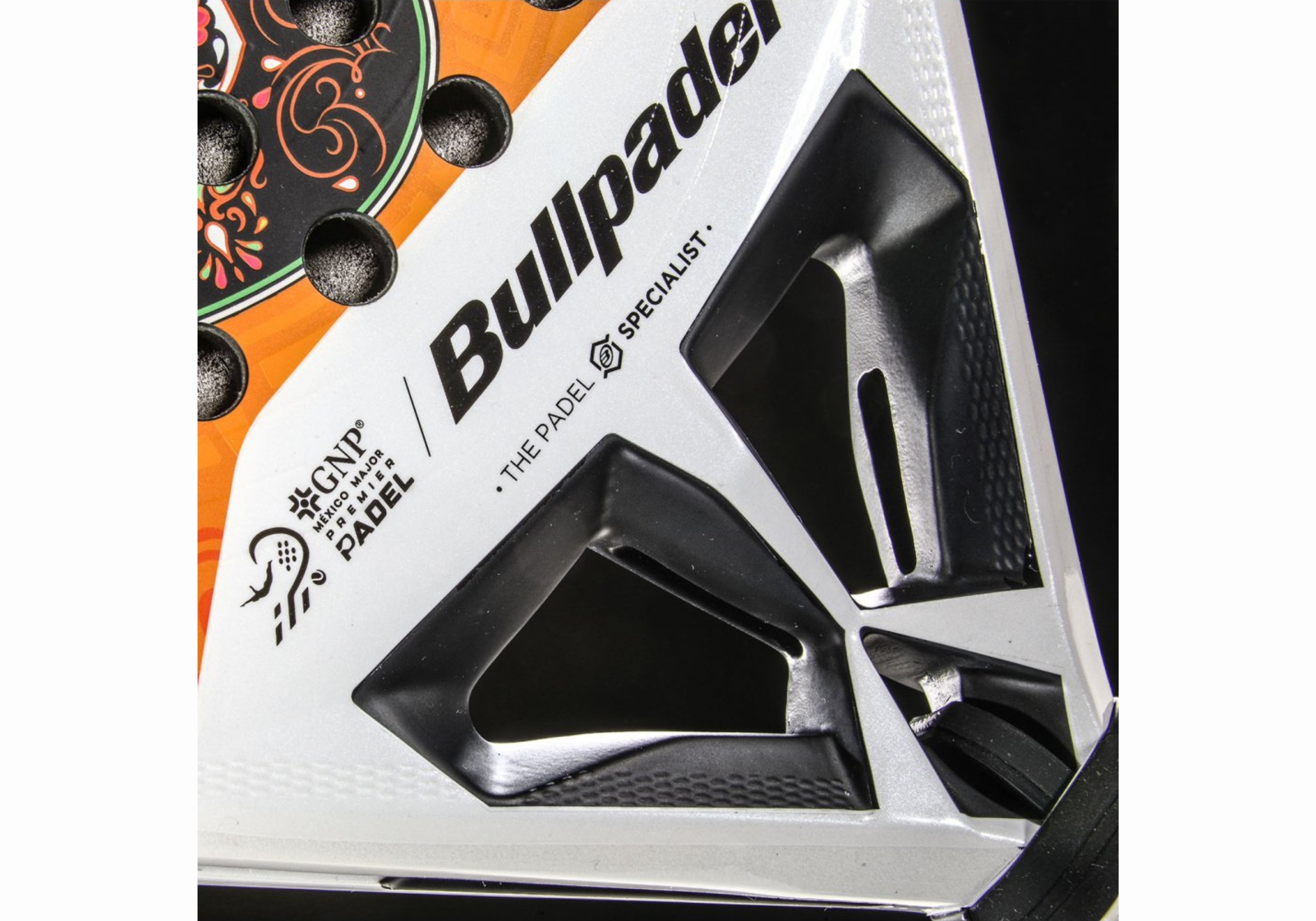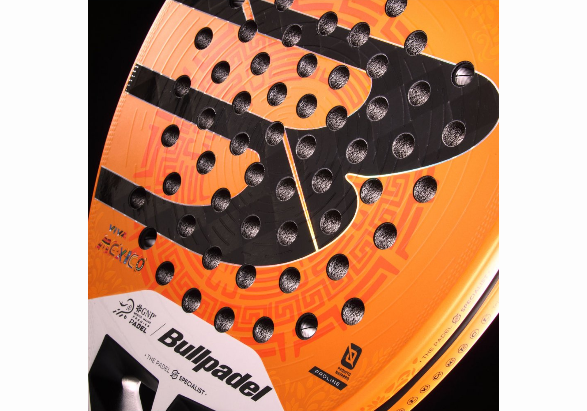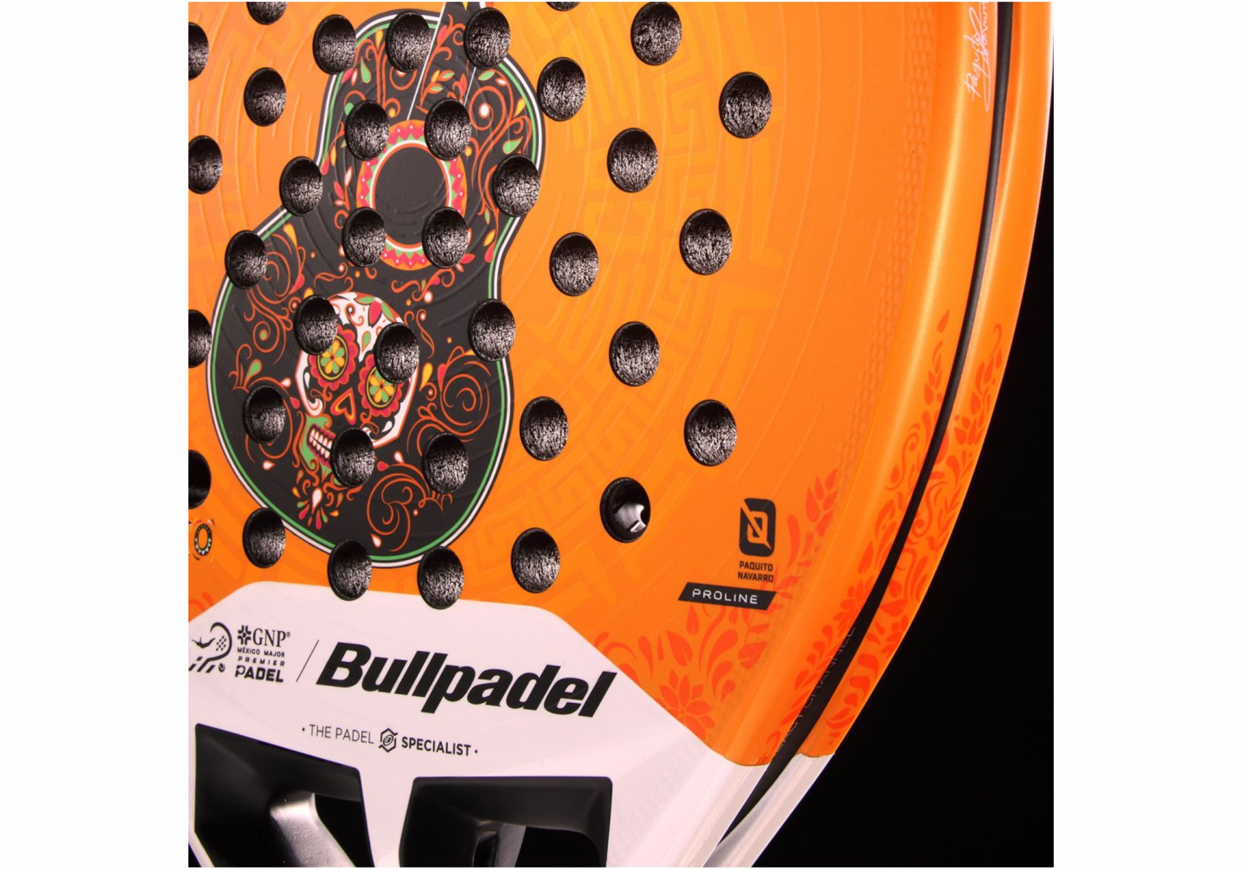 Su intenso color naranja evoca la calidez y la vitalidad del país, mientras que el diseño de la superficie destaca por una guitarra ornamental inspirada en el arte popular, símbolo de la tradición, música y pasión mexicanas. Los acabados incorporan detalles florales y elegantes contrastes en negro y dorado, aportando profundidad y una sofisticación distintiva a la pala. El logotipo Bullpadel en gran formato equilibra la innovación de la pala con su herencia, y como sello final, lleva la firma de Paquito Navarro y la inscripción exclusiva "VIVA MÉXICO", reforzando su carácter de edición especial y su profundo tributo a este país inspirador.